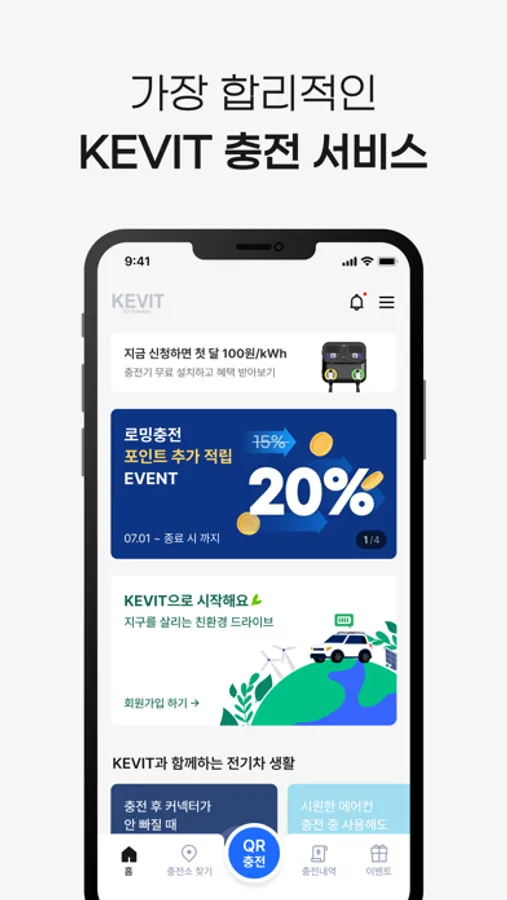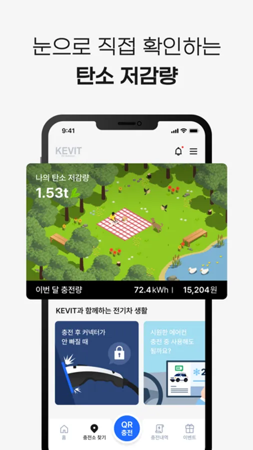 별도의 회원카드 발급 절차 없이 KEVIT 충전서비스 앱으로 QR코드를 스캔하여 충전할 수 있습니다. 충전이 종료되면 자동으로 사용량만큼 과금 결제됩니다.