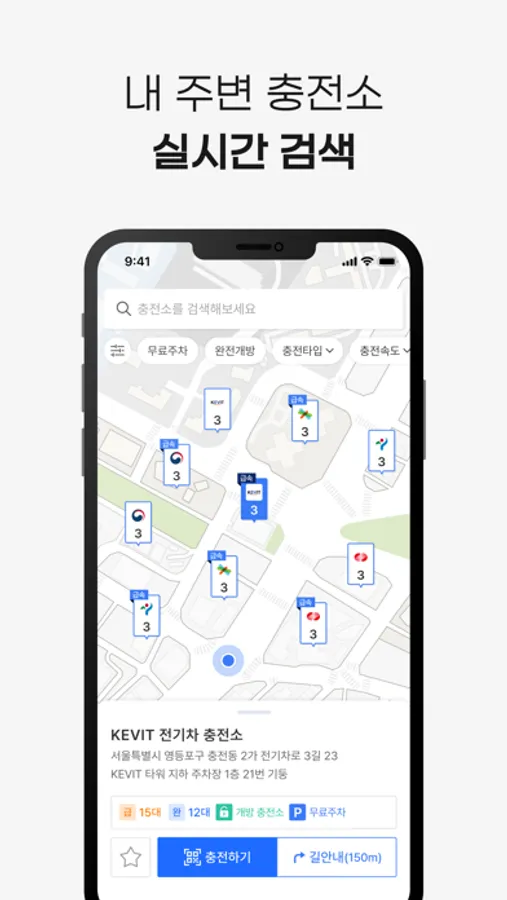 4. 충전소 실시간 검색 충전타입, 주차요금 필터를 적용하여 내게 맞는 KEVIT 충전소를 조회할 수 있습니다. 또한 지도를 통해 전국에 있는 KEVIT 충전소를 직접 검색하거나 충전기의 실시간 상태정보를 확인할 수 있습니다.