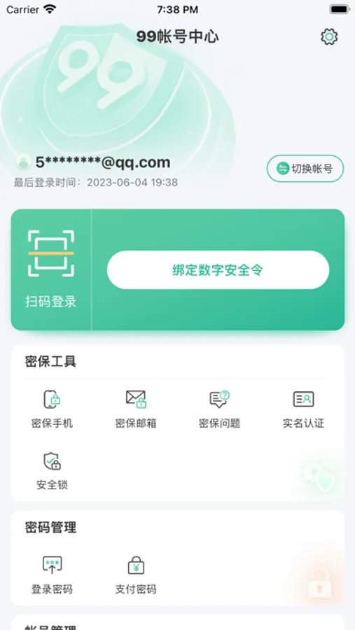 99帐号中心,为网龙网络公司旗下游戏帐号的手机端安全中心,涉及帐号密保信息修改、密码修改等功能;