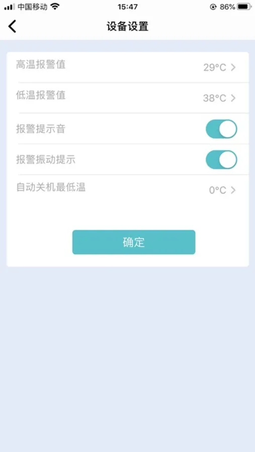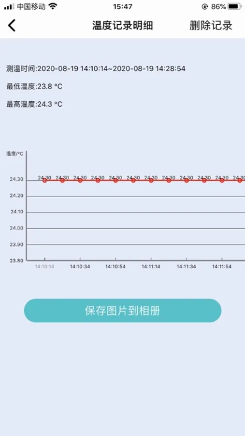 APP可以在后台保持长时间运行,当温度达到设置的最高温或低于用户设置的最低温度的时候,会报警提示;用户可以查看温度记录并将温度记录转化为图片保存在手机中.