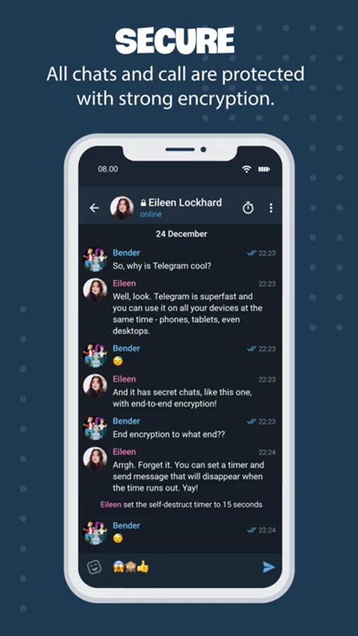 + Tele messenger chat secure is an UNOFFICIAL messaging app that uses Telegram's API and add new features and it can work with internal proxies.