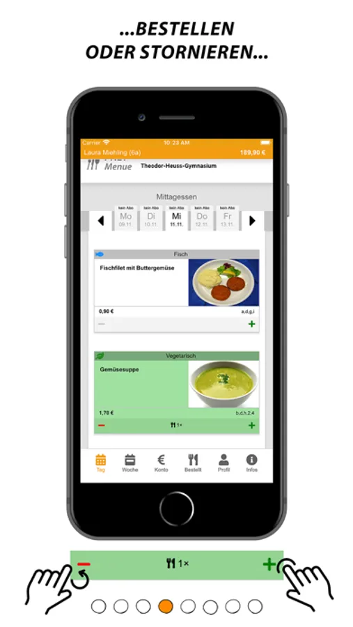 Gerichte können im Login ganz leicht bestellt werden, sofern das Guthaben auf dem Buchungskonto ausreicht. Mit dem „+“-Button wird das Gericht „ausgewählt“ und in einem weiteren Schritt (vor-)bestellt. Ist eine Teilnahme an der Gemeinschaftsverpflegung einmal nicht möglich, kann das Essen auch innerhalb der vorgegebenen Frist mit dem „-“-Button abbestellt und „storniert“ werden. Grüne Hinweise unterstützen bei den Vorgängen.