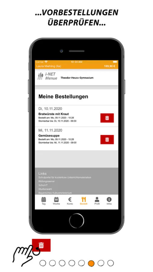 Dank der Übersicht mit allen Vorbestellungen kann leicht überprüft werden, wann welches Essen (vor-)bestellt wurde. Optional kann unter „Meine Bestellungen“ das Essen innerhalb der vorgegebenen Frist, mit dem „Mülleimer“-Button abbestellt und „storniert“ werden.