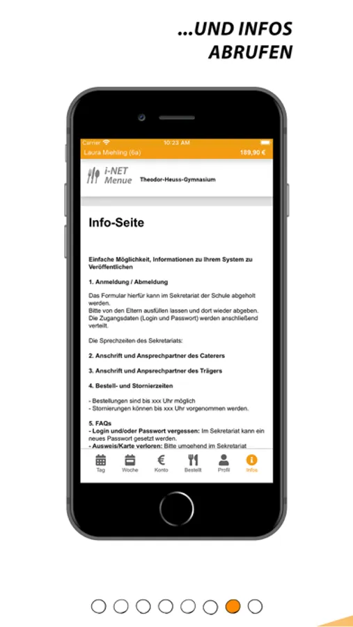Der Info-Bereich beinhaltet alle relevante Mitteilungen zum Angebot der Schulkantine. Auch Ansprechpartner, Abläufe zur An- und Abmeldung sowie allgemeine Bestell- bzw. Stornozeiten und FAQs sind im Bereich „Infos“ nachzulesen.