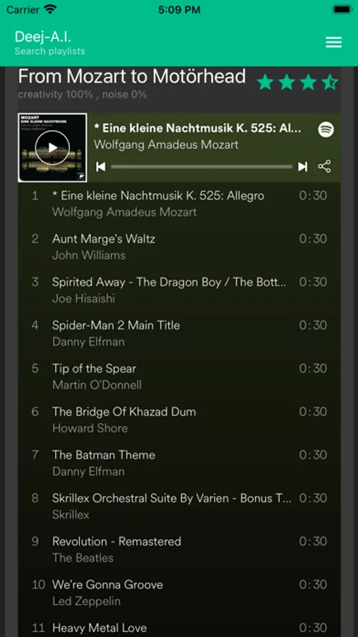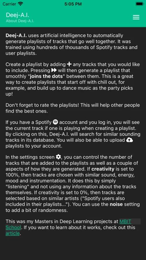Discover new music using Artificial Intelligence to automatically generate playlists based on how the music sounds. Create your own musical journey that smoothly "joins the dots" between the songs that you choose (for example, from Mozart to Motörhead). Try playing around with the creativity parameter.