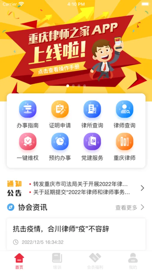 “重庆律师之家”是面向重庆市律师协会会员提供的专业移动应用软件,整个系统架设在云端,重庆律师实习人员等不同类型的用户可以享受到最贴合自身的个性化服务。系统为重庆律师量身打造,实现了律协系统各种服务的定制化接入,会员可凭重庆市律师协会网的账号密码直接登录,免注册;同时提供了律师执业过程中常用的专业工具,实现协会活动报名、在线视频培训、一键维权、预约办事、年度考核、费用计算工具、第三方商城提供的服务等。各种应用功能模块不断增加中。办实事、重服务、求突破谋发展,重庆市律师协会致力于竭尽所能为重庆律师打造最实用的信息化高速公路。