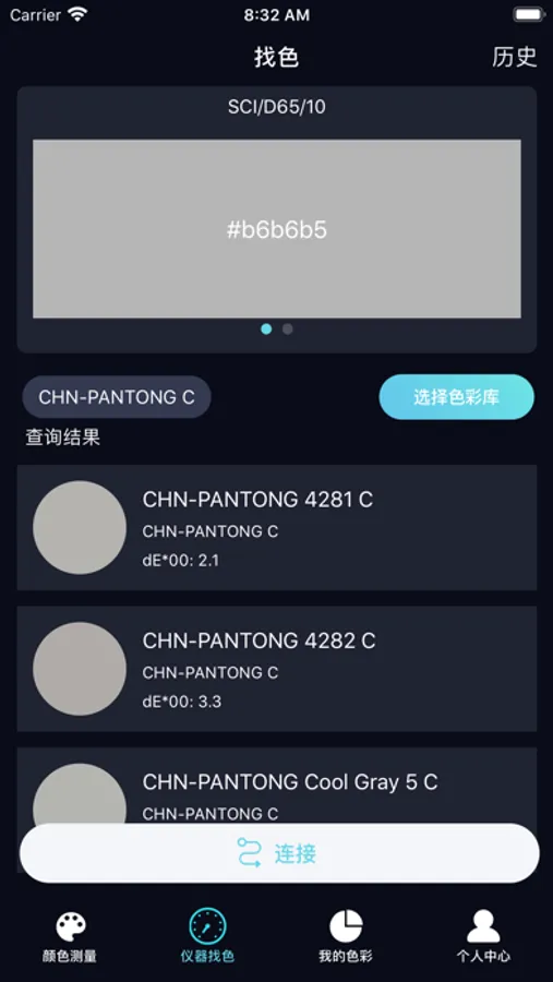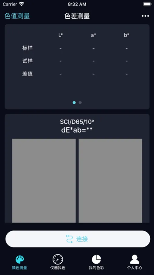1、通过蓝牙连接测色仪,采集颜色数据,设置测色仪参数,对仪器进行校准等操作。