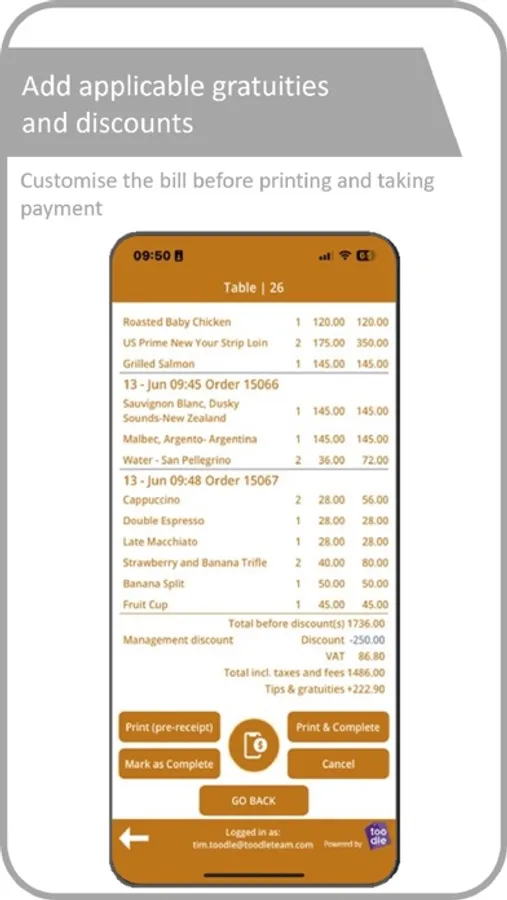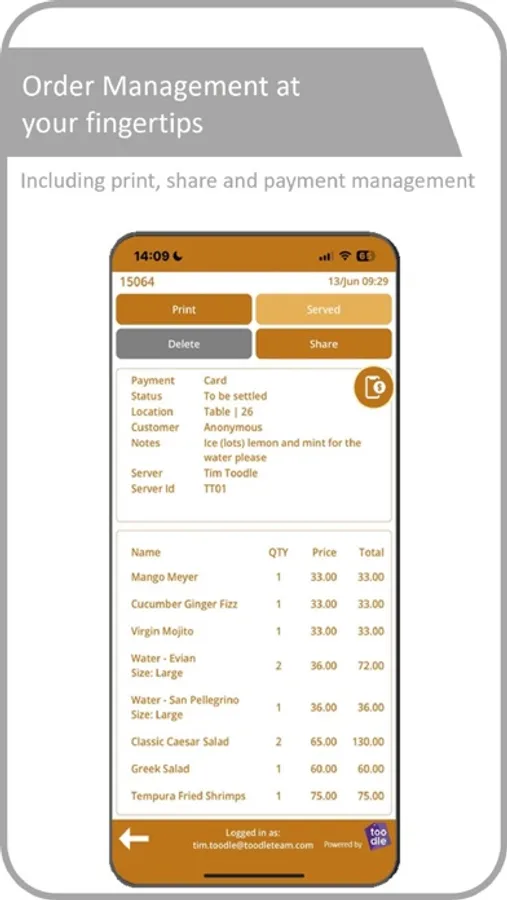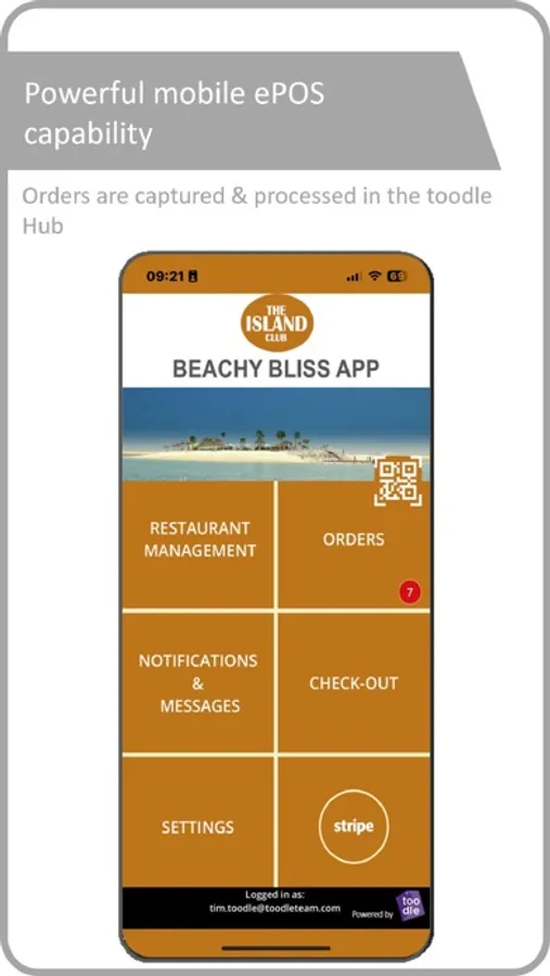 Registered merchant users use the toodle Hub mobile POS to process orders, engage with users, manage their catalogue or menu, publish promotions, run daily reports, and, as applicable, supervisory and managerial users perform outlet management functions - eg. assigning waiting staff to tables and run operational and financial reports.