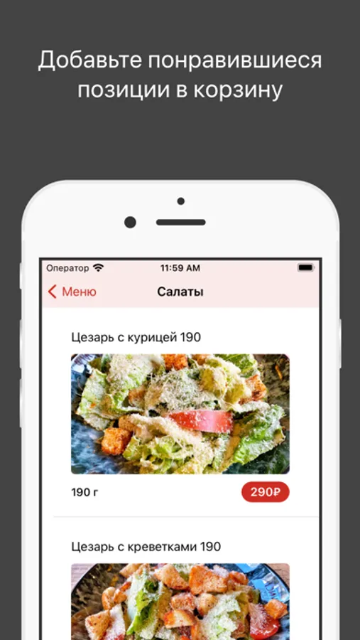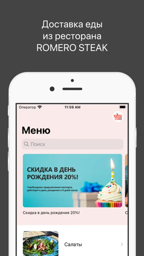 Как сделать заказ в приложении “ROMERO STEAK”: выберите понравившиеся позиции из меню, добавьте их в корзину и перейдите на экран оформления заказа (по нажатию на иконку корзины).