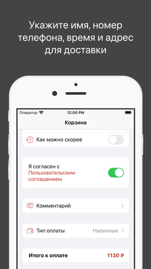 Выберите способ оплаты: Наличными или картой. Примите правила оплаты и нажмите кнопку “Заказать”.