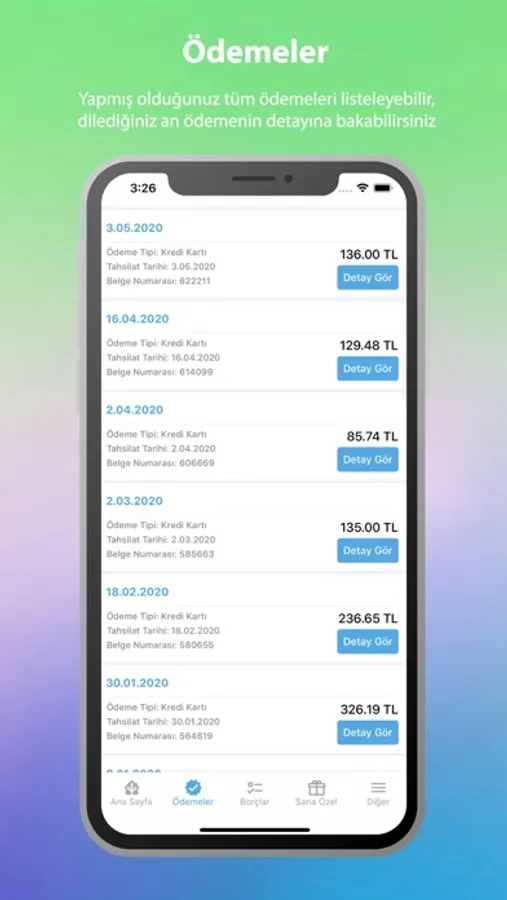 Ödemeler sekmesinde bugüne kadar yapmış olduğunuz tüm ödemelere ve detayına ulaşabilirsiniz.
