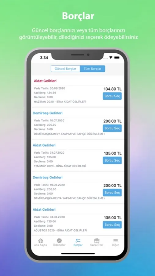 Borçlar sekmesinde güncel borçlar ve tüm borçlar olmak üzere 2 sekme bulunmaktadır. İçinde bulunduğunuz ödemeniz gereken borçlar güncel borçlar sekmesinde, carinize işlenen borçların tamamı iste tüm borçlar içinde bulunmaktadır. Dilerseniz güncel borçlardan dilerseniz tüm borçlardan seçim yaparak kredi kartınızla ödeme gerçekleştirebilirsiniz.