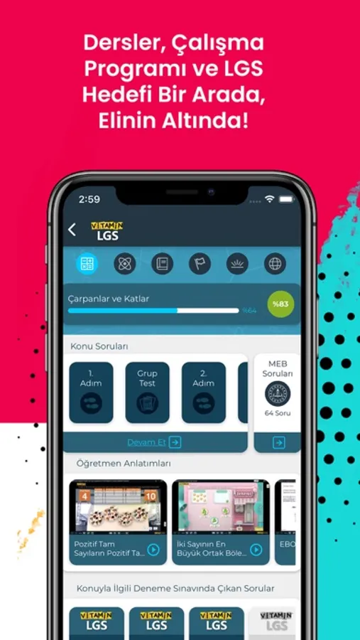 Beceri temelli yeni nesil sorular ve çözüm videoları, kişiye özel çalışma programı, deneme sınavları, eksikleri tamamlamayı sağlayan konu anlatımları, performans takip sistemi ve veli bilgilendirme raporlarıyla öğrenciye LGS hazırlık sürecinde ihtiyacı olan her şeyi bir arada sunar.