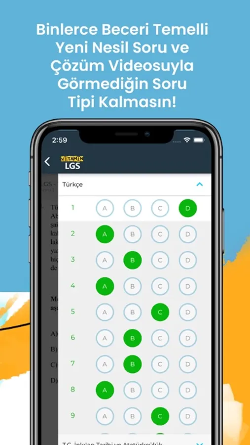 Beceri temelli sorulardan oluşan LGS’de başarılı olmak için sadece konuları bilmek yetmez! Vitamin LGS, öğrencinin sınavda çıkacak soruları çözebilmesi için gereken becerileri kazandırmak amacıyla tasarlanmış akıllı bir soru bankasıdır.