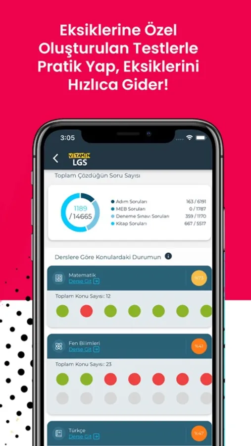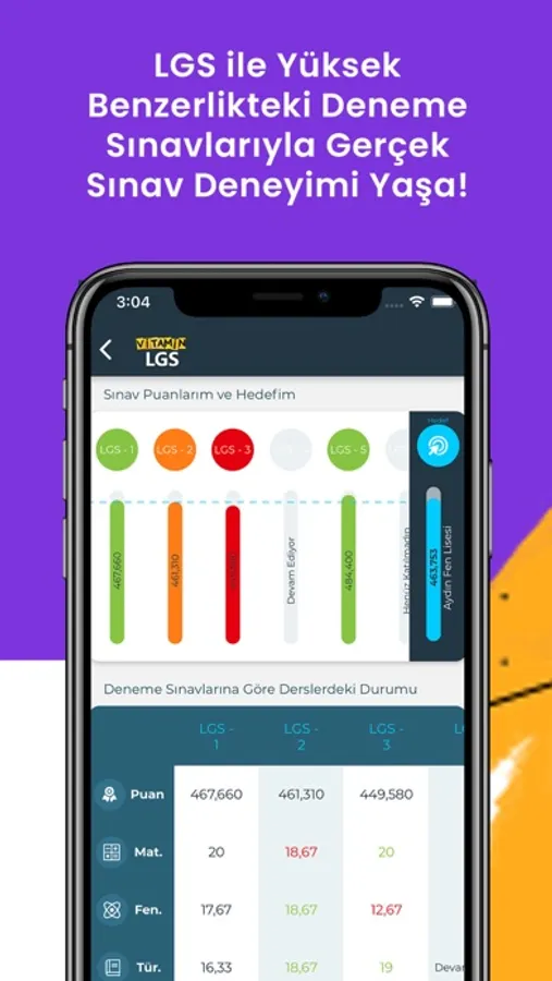 Vitamin LGS; beceri temelli sorularıyla öğrencilerin adım adım soru çözme becerilerini geliştirir, deneme sınavlarıyla gelişimini izler, konu anlatımları ve telafi sorularıyla öğrenciyi destekler, ayrıntılı performans raporlarıyla eksiklerini görerek tamamlamasını sağlar.