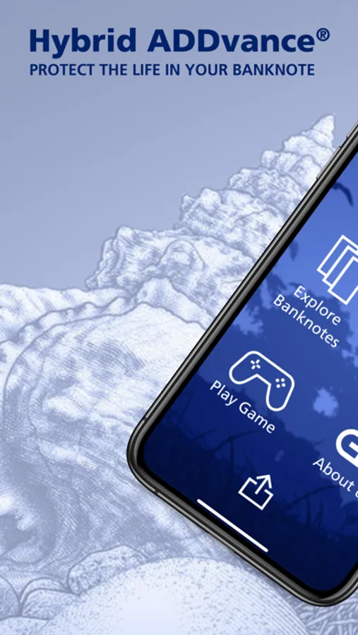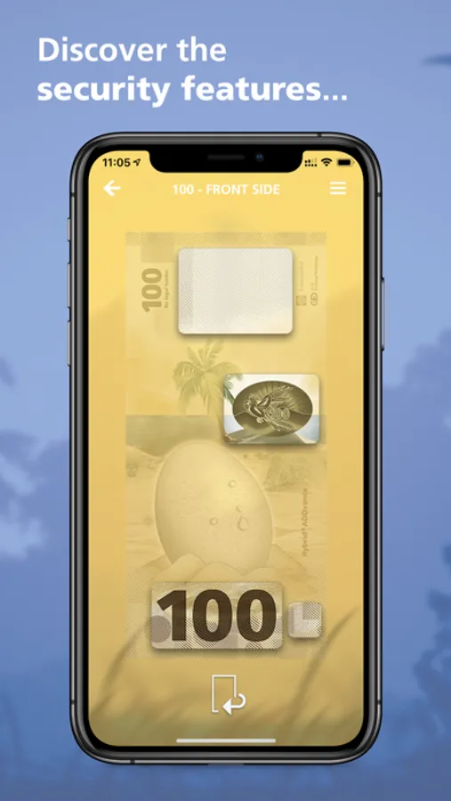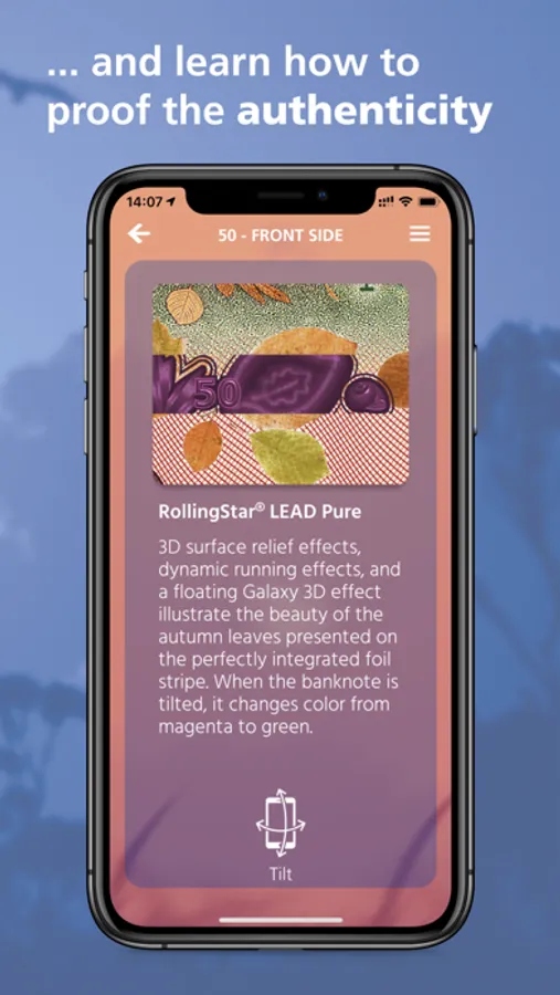 By tilting your smartphone, a movement effect of the dynamic foils or the watermark can be simulated. You can activate the magnifying glass function by touching the marked area with your finger or experience the intaglio printed areas with a vibration response. In this way you will learn how to authenticate the banknote’s security features reliably and effectively.