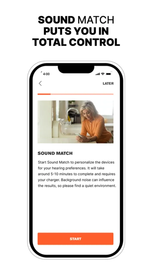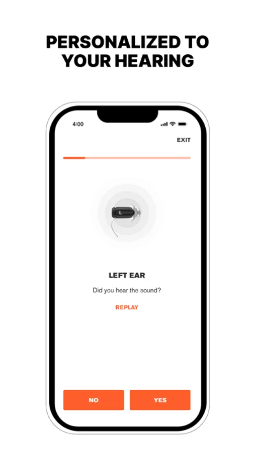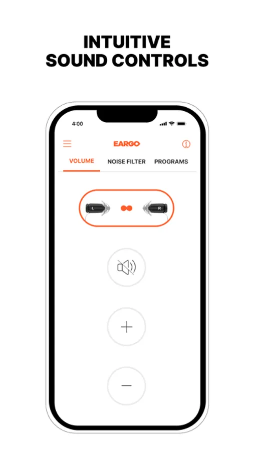 • Complete Eargo Sound Match to personalize your device to your unique hearing preferences. Sound Match appears automatically during first-time app use and can be accessed anytime from the app menu.