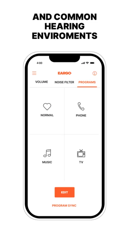 - Make situational adjustments to your hearing devices from the app. Change the program, mute/unmute, and increase/decrease the Noise Filter for your preferred speech clarity. (Features vary by product).