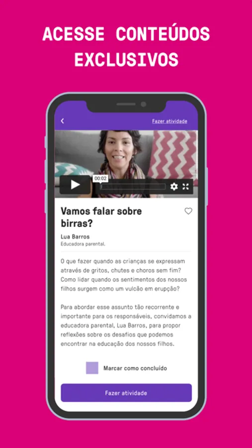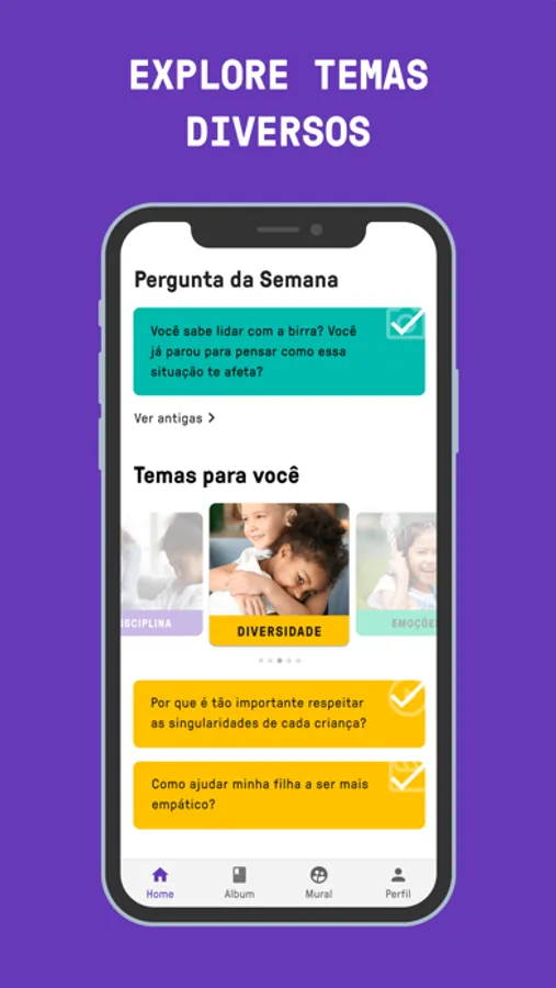 Aqui você encontrará conteúdo e atividades práticas para serem feitas em família que abordam os temas mais pedidos por vocês como: Desenvolvimento, Disciplina, Diversidade, Emoções e Relações.
