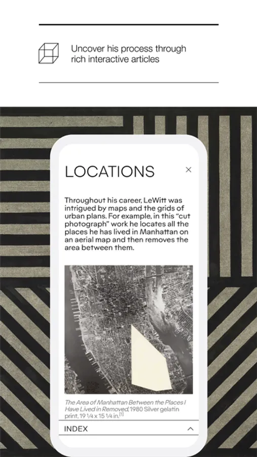 Mapping LeWitt: Explore LeWitt's life within a map-driven timeline to see his global influence. Each entry includes an in-depth article with images and media provided by the LeWitt Estate. Enable your iPhone’s GPS to see how far you are from the closest scannable artwork.