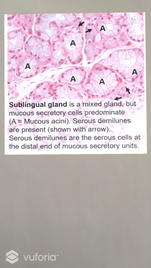 This augmented reality application enhances dental histology flash cards by providing labelled information on top of bare histological images. The labelling detail overlaid on top of the images allows students to study easier - the physical flash cards that can be printed off from the class instructor are bare histology images for students to label, and when the student is ready to test themselves, this app provides labelling of the structures in the images using augmented reality.