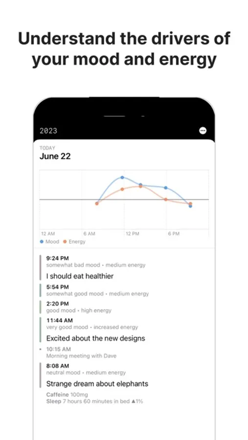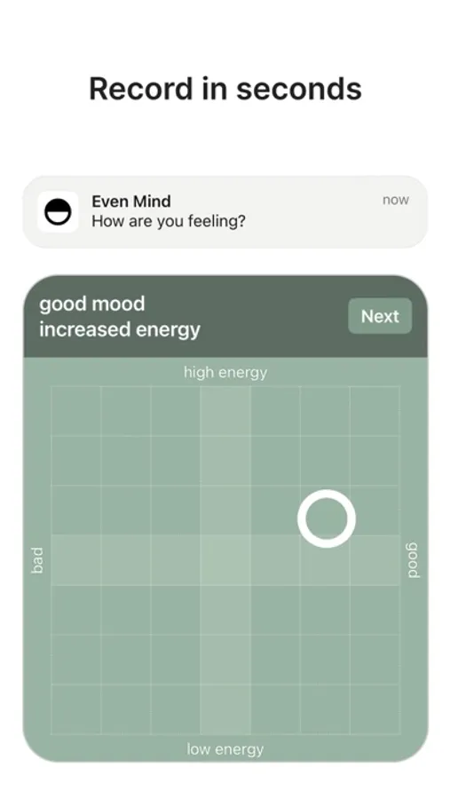 Even Mind helps you record your mental health in detail. Use it to bring attention to how you feel, build self-knowledge, and improve your mental fitness.