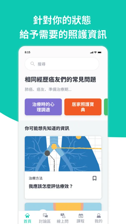 台灣癌症基金會的專業照護團隊,成立台癌e照護,化身數位癌症個管師,針對你的個人狀態,提供你想知道的答案,陪伴著你度過抗癌時光,這一路上不孤單。