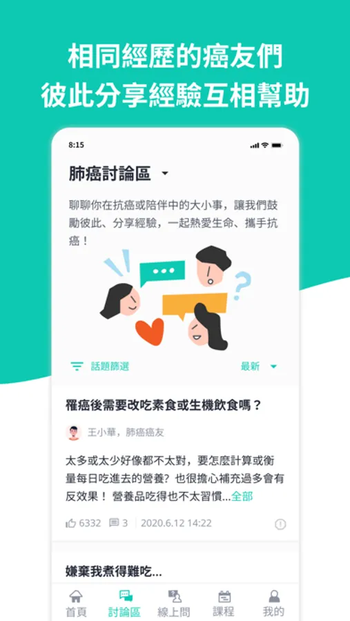 抗癌的心情,他人若沒有經歷,可能很難了解。但別擔心,有一群與你並肩作戰的戰友,你的心情他們懂,在這裡大家彼此分享經驗,互相打氣、攜手抗癌。