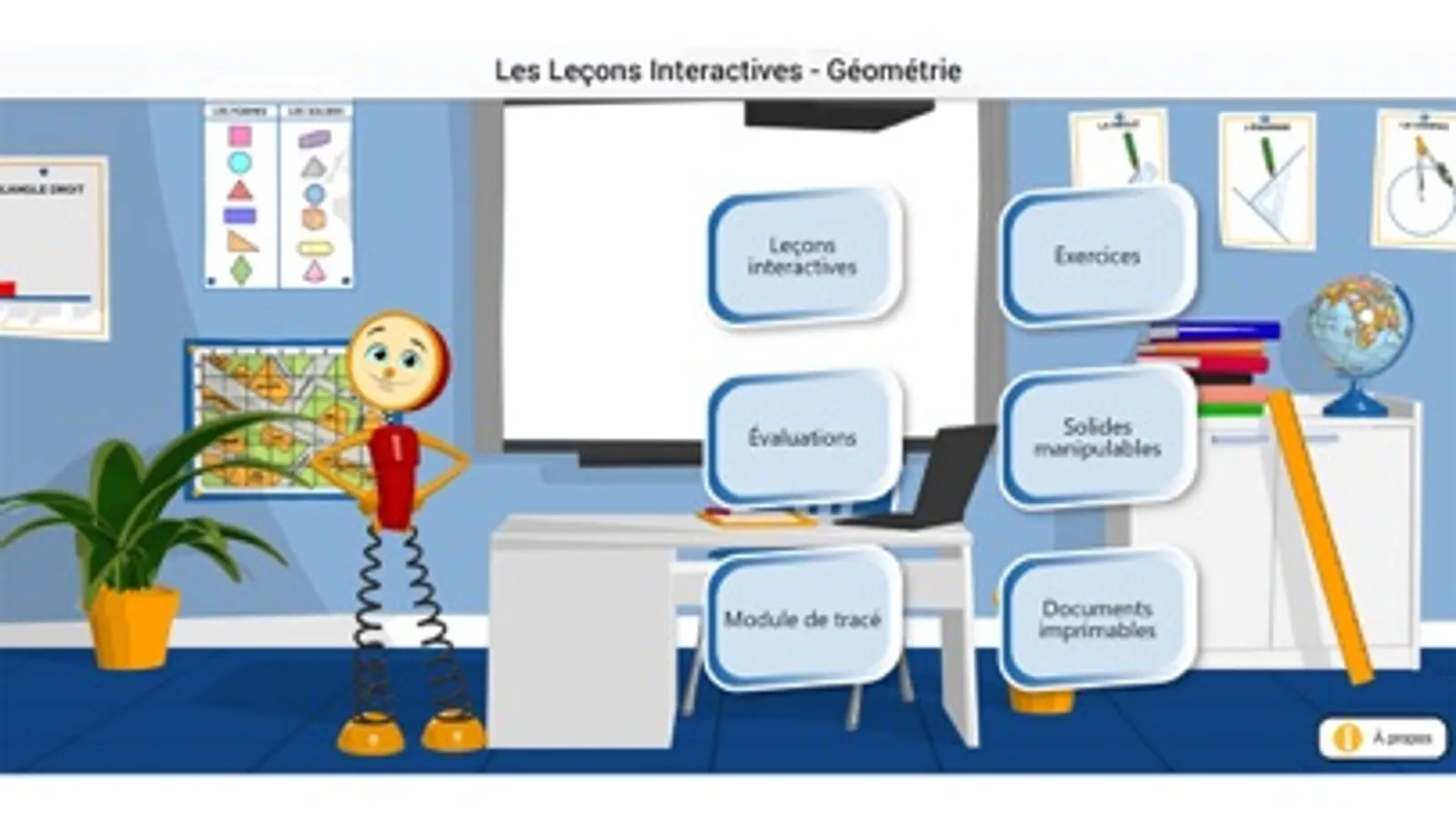 L’application contient : 13 leçons CP, 15 leçons CE1, 14 leçons CE2 - 126 exercices interactifs et leur corrigé - 17 évaluations à projeter ou à imprimer - 1 module pour manipuler les formes géométriques et réaliser des tracés - 1 module pour manipuler des solides numériques - 66 fiches de recherche - 42 fiches « Je retiens ! »