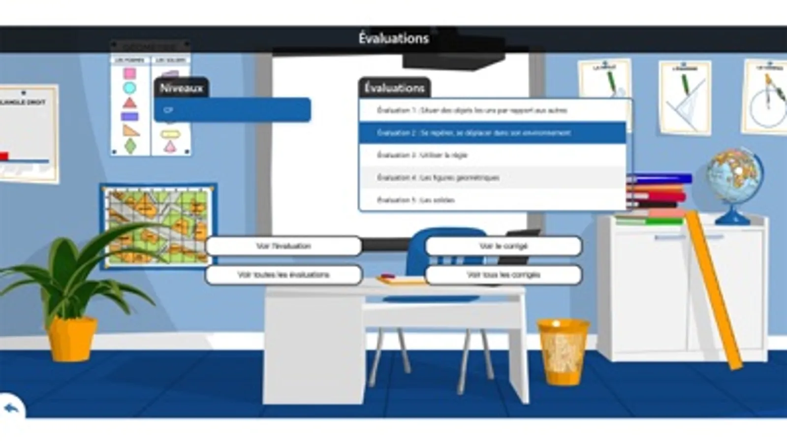 Les évaluations permettent de valider les connaissances acquises au cours des leçons. Les évaluations et leur corrigé peuvent être projetés ou imprimés.