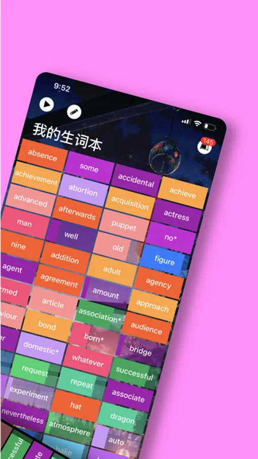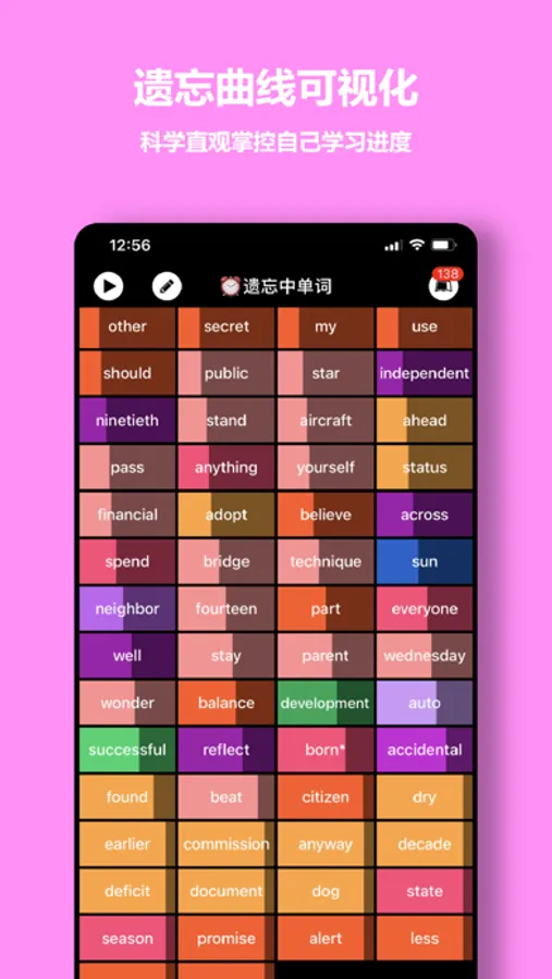 进入应用里,您会看见各个单词以不同的颜色显示在界面上。这就是“单词块”独创的色彩记忆系统。每一种颜色代表着您对这个单词的熟悉程度,而熟悉度由系统根据您的每一次学习状态由AI智能算法分析计算得出。您可以通过颜色块直观的了解到哪些单词自己比较熟悉或者陌生、哪些单词刚刚学过、哪些单词正处于遗忘时期需要尽快复习等。