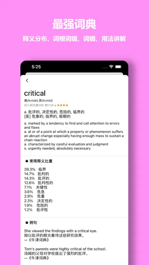本应用的单词数据库根据各类考试大纲和语料库词频收录数十万条各类单词的英文和中文释义,整合了市面上各类免费和开源资料,利用 BNC/COCA 语料库进行词频矫正,并使用 NodeBox, WordNet 等自然语言处理工具包对各类时态语态,派生词等进行补充和标注。并根据考试大纲和柯林斯星级还有牛津 3000核心词进行标注,让你一眼就能看出这个单词的重要性。