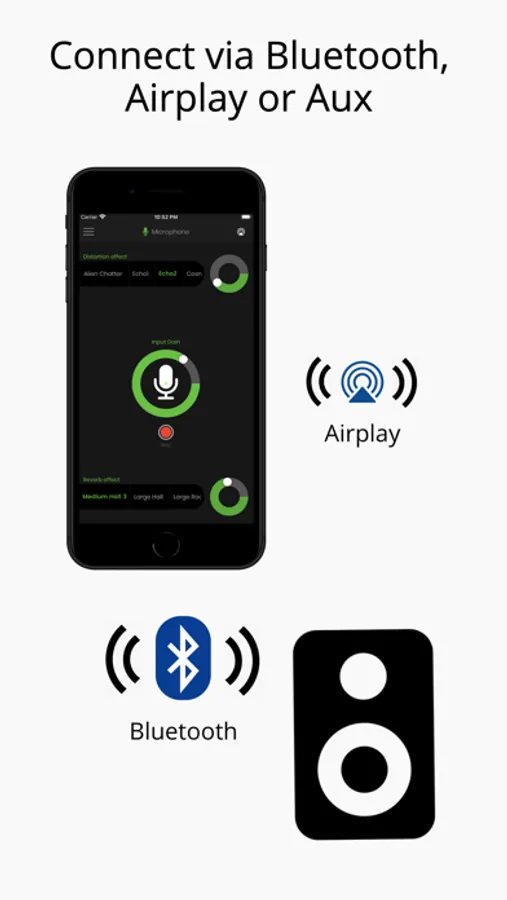 Whenever you feel like singing or you want everyone to hear you. Connect your iPhone with external speakers via bluetooth, airplay or aux and open the Live Mic app. Apply the voice filters and feel like the greatest showman.