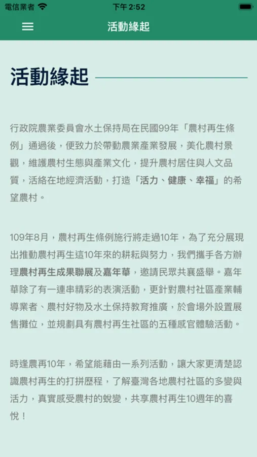 農村再生10歲囉~今年9/25-9/27「農村再生成果聯展暨嘉年華會」就在臺北松山文創園區。活動最新消息、玩農村集章趣,都在「農村再生 10載幸福」APP裡,一同感受農村的蛻變與美麗!