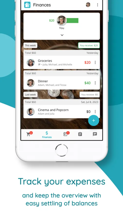 • Just got done with shopping? Create a finance entry and let your expenses be split up immediately.