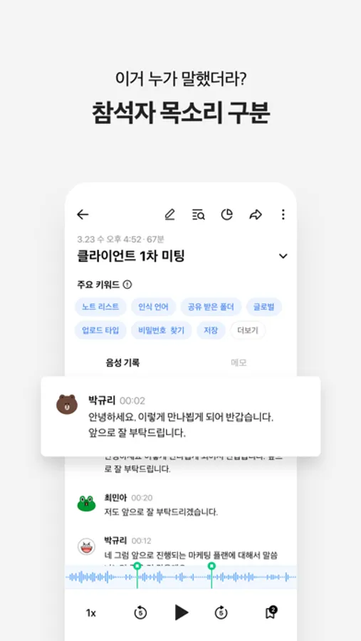 참석자의 목소리를 구분해서 음성 기록을 정리해 줘요.
