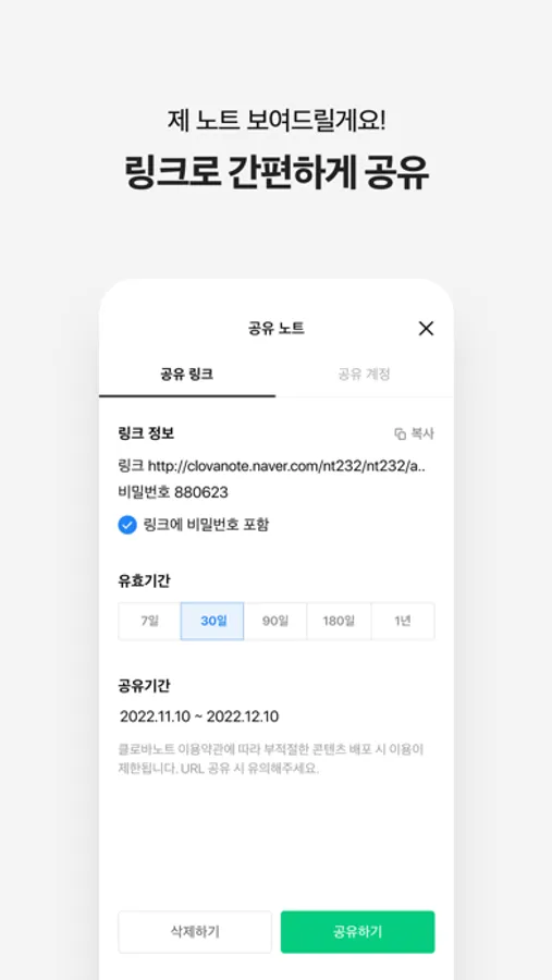 링크와 비밀번호를 공유하면 음성 기록을 함께 볼 수 있어요.