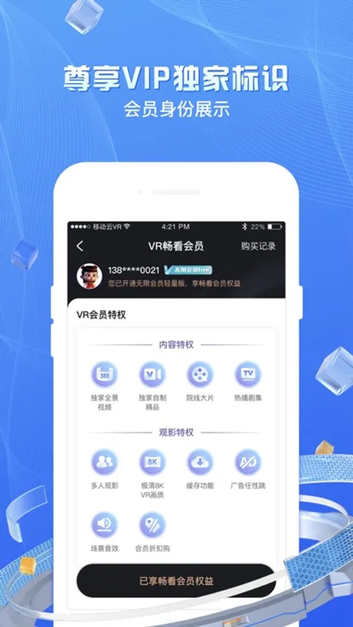 移动云VR app,它让视听体验变得沉浸,让视觉场景变得丰富,让你喜欢的一切都“触手可及”。在这里,你将坐拥专属IMAX云上巨幕影院,获得海量精品影视库,随时随地光临体娱现场,流连于全景自然风光;它还是你的知识“加油站”、游戏“体验馆”,是你与无垠世界的传送“门”,打开移动云VR app,世界总是离你更近一些…