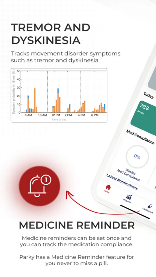 Parky detects tremor and dyskinesia episodes as long as you wear your Apple Watch. You can view your daily/weekly/monthly reports and automatically share with your prescribing clinician.
