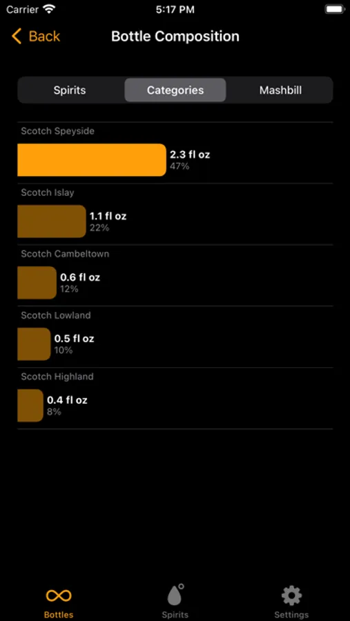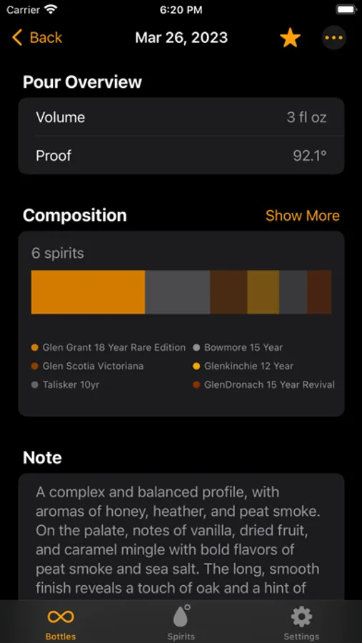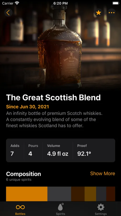 Track your bottle contents in real time with detailed composition data and elegant visualizations. Spend less time tapping and more time sipping by reusing and tracking spirits across all bottles. Upgrade to premium to view detailed breakdowns of every bottle, addition, and pour with exclusive features.