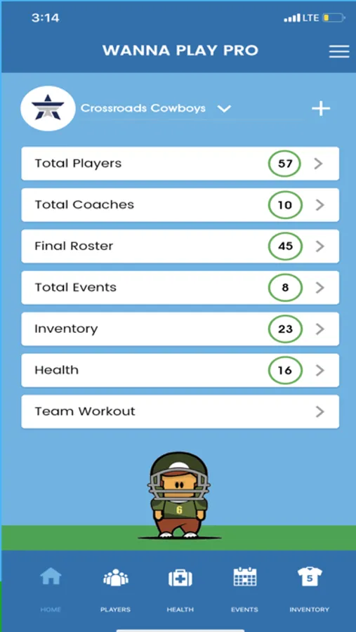 Manage your team digitally from your phone or tablet. Track player workouts, stats run combines and share the data with the players real time. Manage your equipment inventory, who has what, and get it all back. Track injuries when they happen and manage the return to play. WannaPlayPro Coach helps you run your minor, TYFA, Highschool or Varsity program like the pros do.