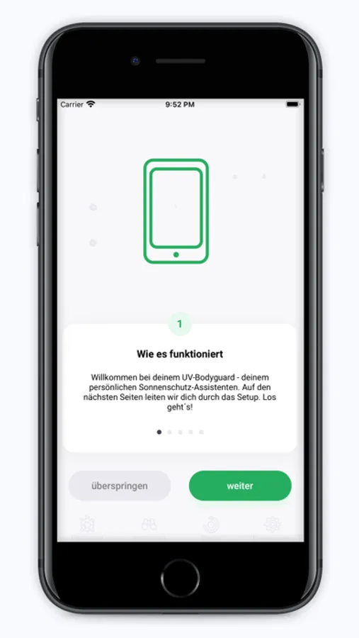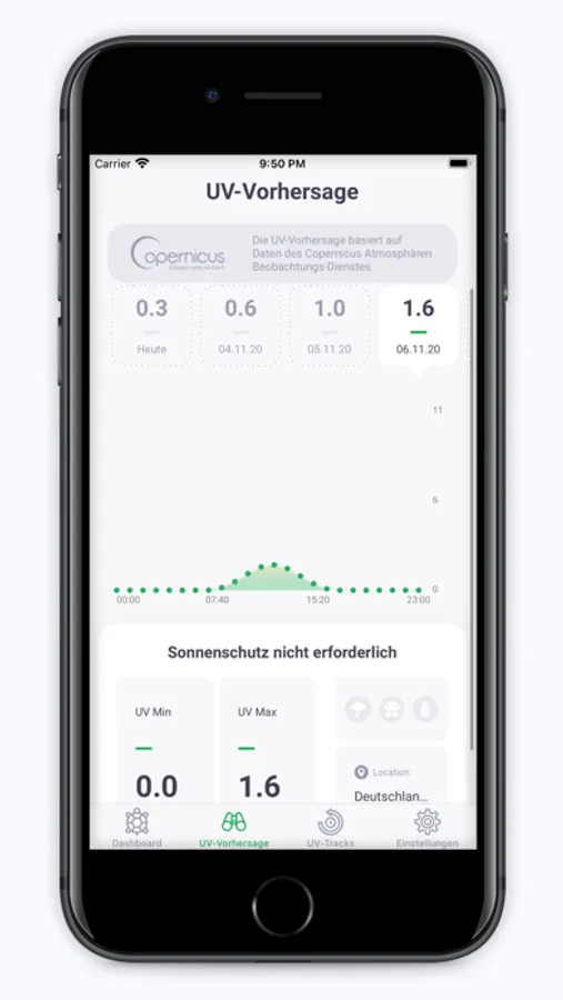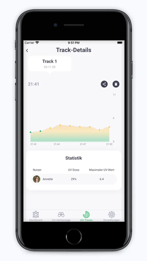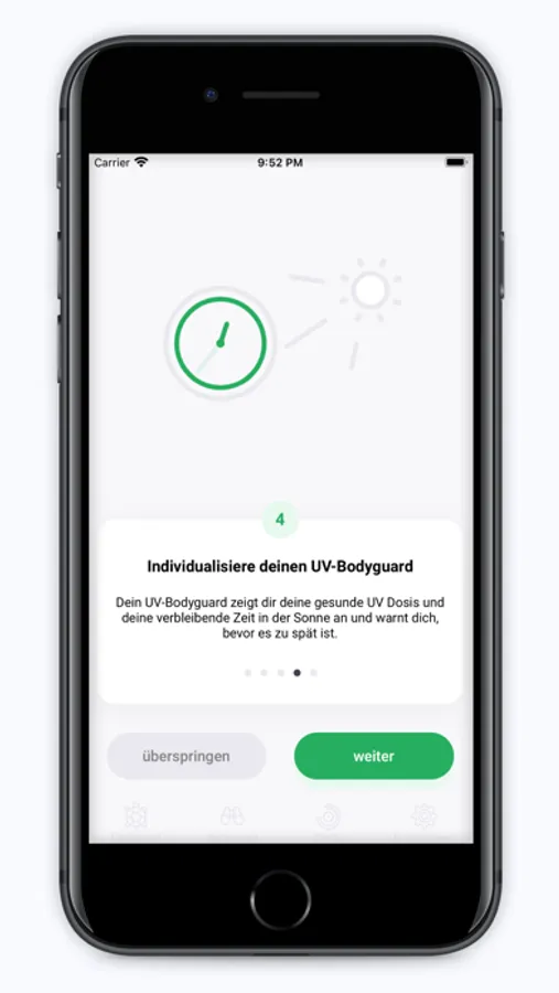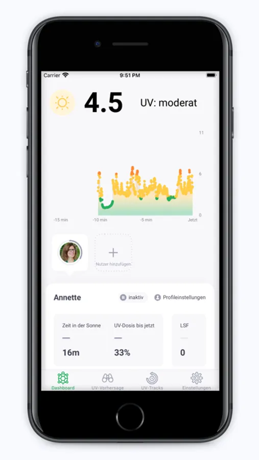 Finde deine individuell gesunde Sonnendosis mit dem UV-Bodyguard! Der UV-Bodyguard ist ein Wearable, das mit der UV-Bodyguard Smartphone App verbunden wird. In der App siehst du in Echtzeit, wie stark die Sonne gerade ist und wie du dich am besten vor zu viel Sonne schützen solltest. Mit einem Lifetime- oder monatlichen Abo kannst du ein oder mehrere Nutzerprofile mit Hauttyp und verwendeter Sonnencreme anlegen. So siehst du immer, wie viel % deiner individuell gesunden UV Dosis du schon erreicht hast, wie lange du noch in der Sonne bleiben solltest (Vitamin D) oder bleiben kannst (Sonnenbrand). Und die wirst rechtzeitig gewarnt, bevor es zu spät ist. Du siehst eine UV-Vorhersage für die nächsten Tage (basierend auf den Satellitendaten des Europäischen Raumfahrtprogramms Copernicus), und kannst deine aufgezeichneten UV-Tracks sehen.