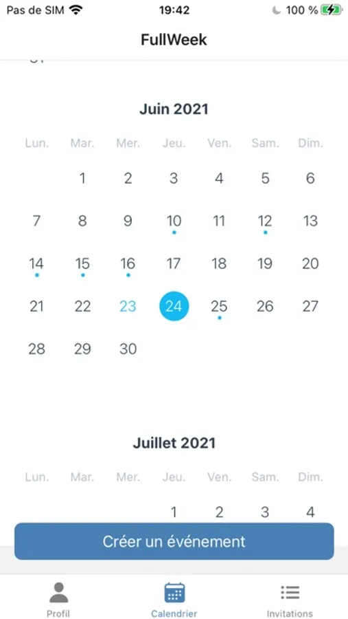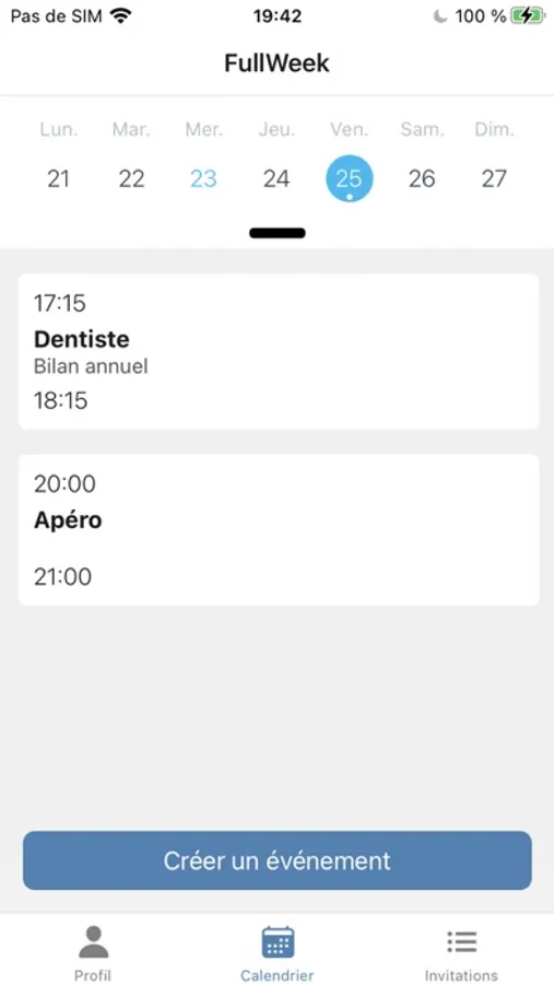 FullWeek est une app qui vous permet d'organiser votre calendrier de façon collaborative. Notez vos événements, invitez des amis à vous rejoindre... FullWeek sera votre assistant pour organiser vos événements à plusieurs. Qui amène les boissons ? A quelle heure on arrive ? Paul sera en retard ? Tout est sur FullWeek.