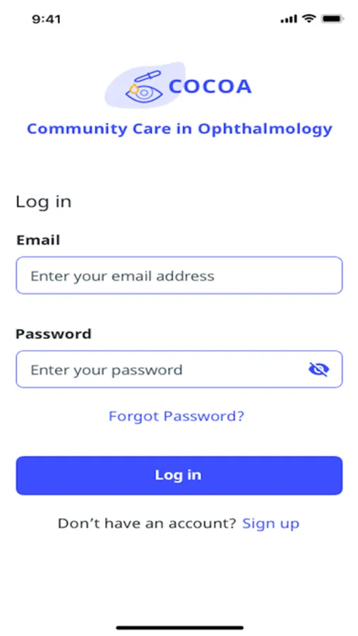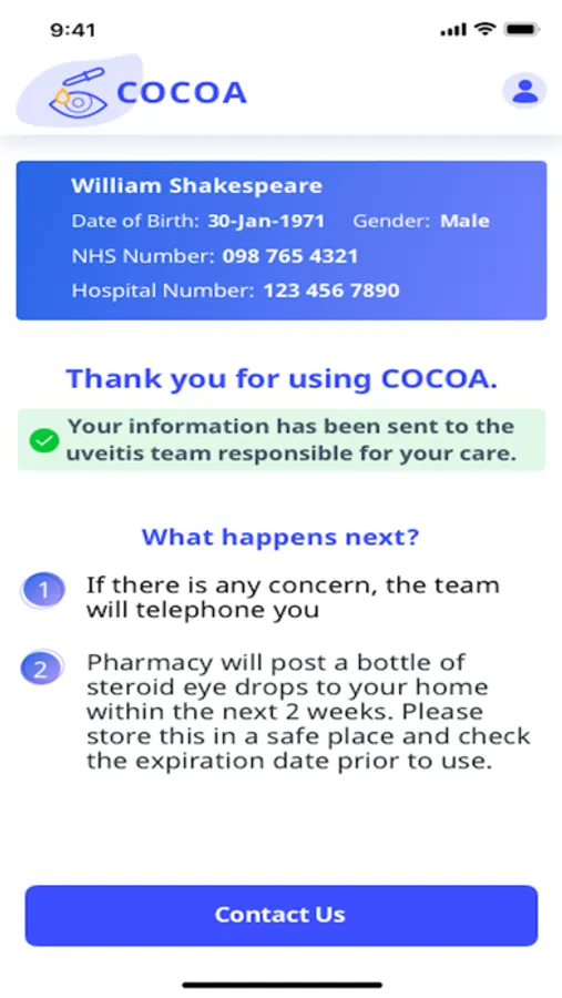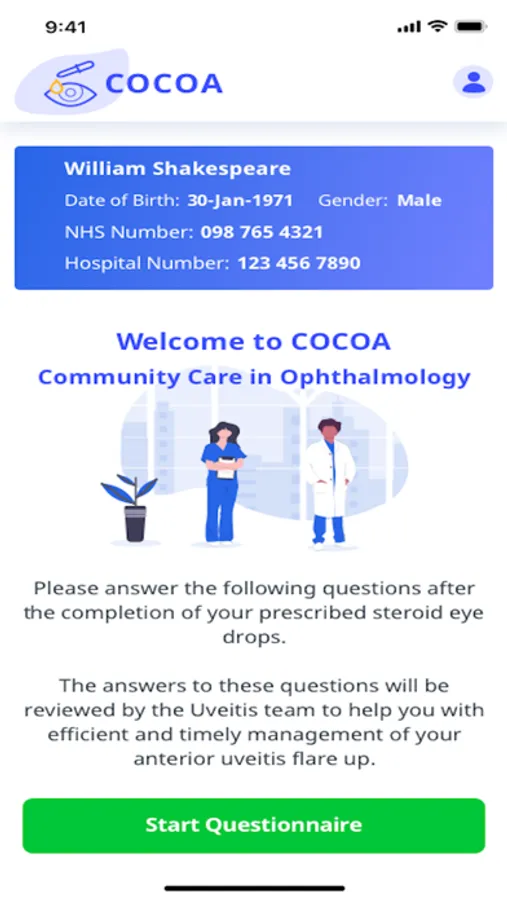 COCOA is a mobile application which enables patients with recurrent Anterior Uveitis to self-care, record their Visual Acuity (VA) and Intraocular Pressure (IOP) measurements obtained outside the hospital environment (i.e. their local Optometrist).