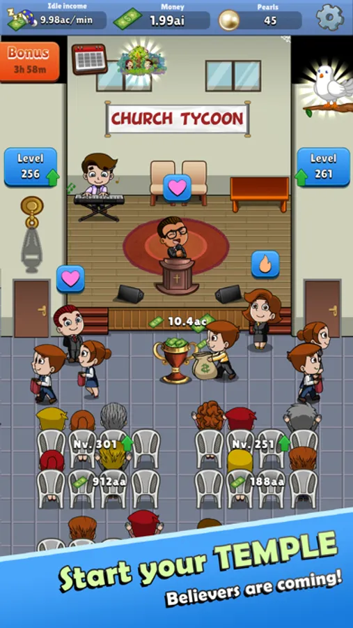 - Get idle money: Your pastors will work in your business and collect donations even when you are not playing, very good for casual gamers!