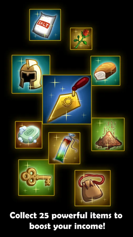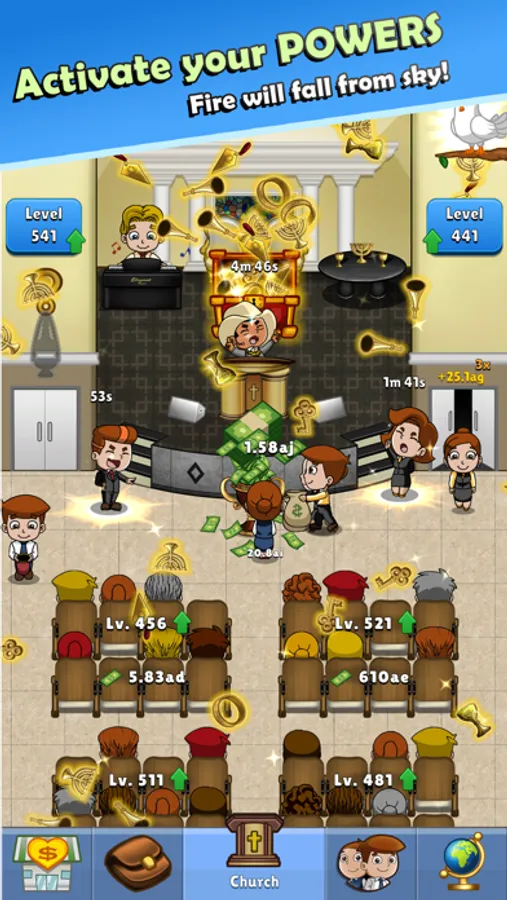 - Collect up to 25 items of faith with unique benefits that can be used in your strategy to earn even more money! They also boost idle money!
