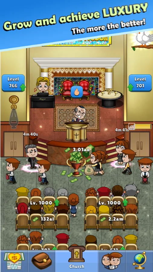 Church Tycoon is a casual church management simulator where the goal is to invest the profits from donations and increase your business to attract believers, create new churches and spread your message as far as possible. The best way to play this idle simulator is to find the best management strategy between each sector of the church, managing the pastors responsible for them and using their powers wisely to improve the flow of donation collection while creating new seats for the faithful. With the income you earn, you increase your church, create new temples and hire new pastors, bishops and even apostles! In addition, you will be able to upgrade your churches and multiply your income many times over! You will also make idle money every day to invest in your business. Use it well in your strategy! Enjoy your benefits as a church entrepreneur in this church simulator and make a lot of money while spreading your message of faith and love to the world of Church Tycoon!