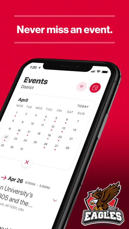 The event section shows a list of events throughout the district. Users can add an event to your calendar to share the event with friends and family with one tap.
