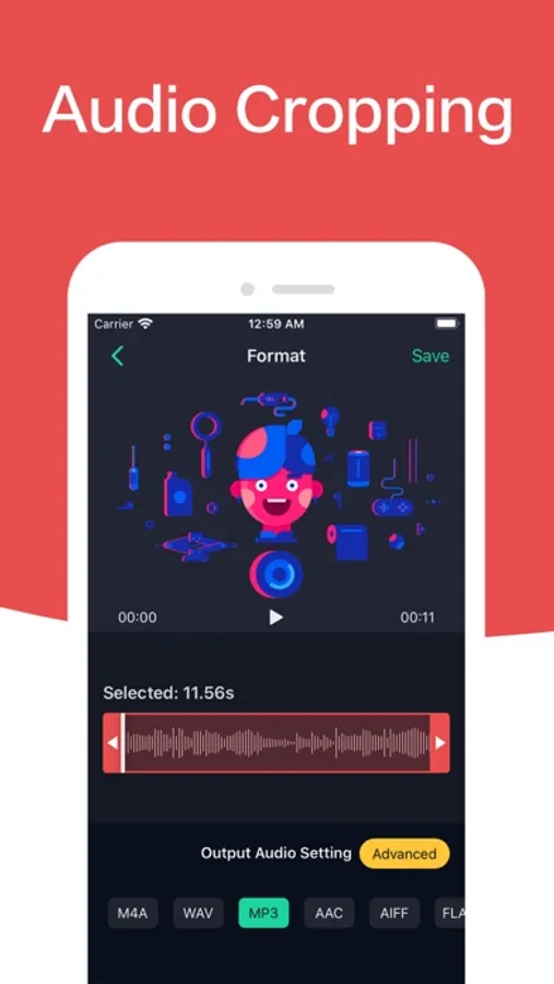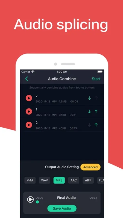 Support audio format conversion, support m4a, wav, mp3, aac, aiff, flac, caf and other audio formats