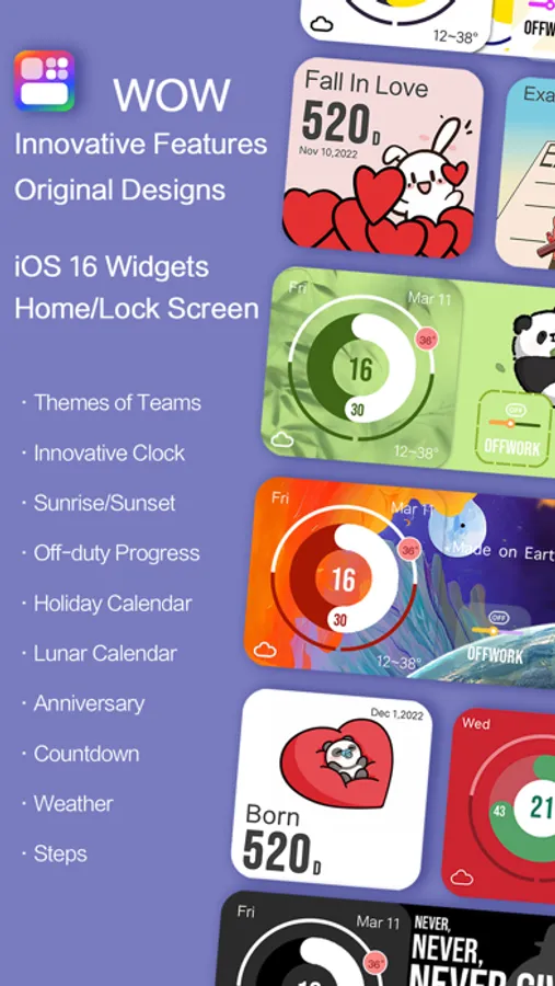 According to the brand new home screen widget and lock screen of iOS 16, 「Watch Out Widgets」provides an easier and more efficient way to get information of the time, weather, calendar, date, week, weekend, anniversary, countdown, health, steps, holidays, progress of work, etc.